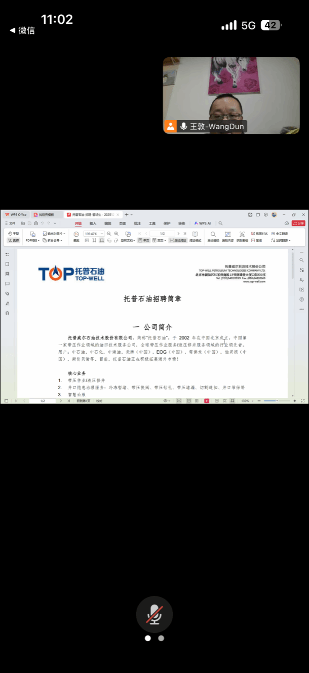 为让毕业生充分了解岗位信息,托普威尔石油技术股份有限公司负责人线上解读了岗位要求、薪资待遇及发展前景。面试环节聚焦 “专业匹配度、家庭支持度、岗位认可度” 三大核心维度,让用人单位全方位了解毕业生情况。参加招聘会的毕业生们结合在外院的学习经历,详细阐述了专业主攻方向、核心课程成绩、学术实践成果及技能证书,充分展现了学院人才培养的扎实成效。同时毕业生们坦诚交流了家庭情况、以及对海外工作的态度及未来生活规划,有同学提到“父母支持海外就业,在实践中提升自己”“家人的支持是我赴海外工作的坚强后盾”,家庭的理解与支持为毕业生奔赴海外岗位增添了底气。