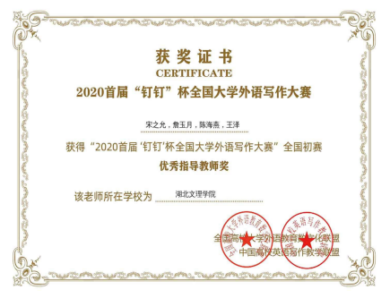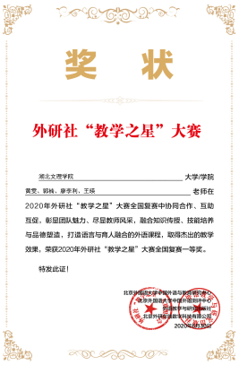 在2020年外研社主办的“教学之星”全国英语教学大赛中,我院“大学英语组”、“综合英语组”双双获得“一等奖”,全省唯一。