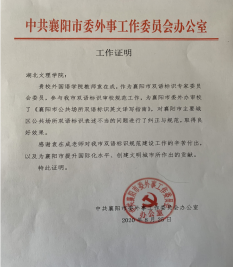 2、襄阳市双语标识专家委员会委员袁在成、詹玉月参与《襄阳市公共场所双语标识英文译写指南》工作。
