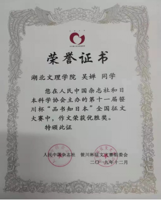 吴婵同学在“品书知日本”全国征文大赛中获优胜奖,为突破性成果,为学校争得荣誉。