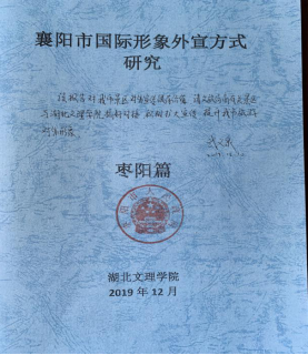 1、袁在成、宋之允团队项目“襄阳市国际形象外宣方式研究”枣阳篇,获得枣阳市政府签批推行。