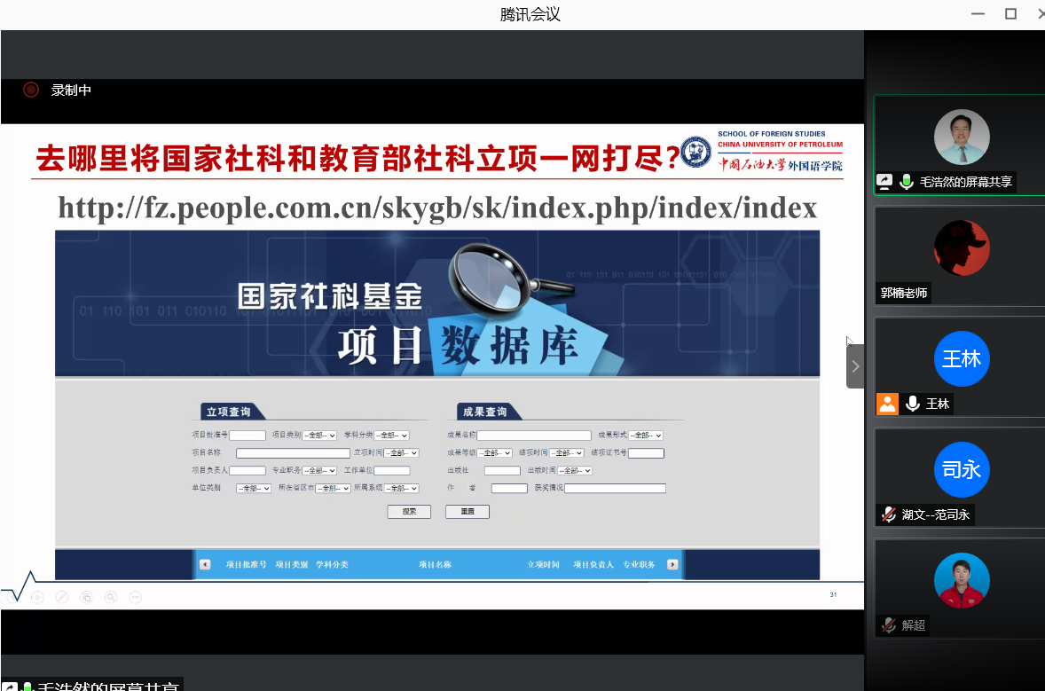 (太阳集团通讯员 王林)2021年3月22日晚,中国石油大学(华东)太阳集团院长毛浩然教授应邀作客“隆中讲坛”,通过线上为太阳集团教师作了题为“国家社科项目申报的痛与通”的学术讲座。讲座由外国语副院长王林主持,外语学院及其它学院部分教师共80余人聆听了讲座。