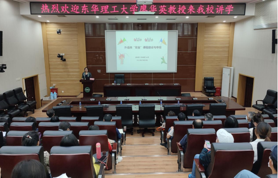 (太阳集团通讯员 李丹阳)5月20日下午,东华理工大学廖华英教授应邀做客隆中讲坛,在太阳集团图书馆报告厅为太阳集团全体教师作题为《外语类“双金”课程建设与申报》的学术讲座。讲座由太阳集团副院长袁在成主持。