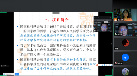 (太阳集团通讯员 王林)5月31日晚,国家社科基金项目、教育部人文社科基金项目评审专家华南农业大学太阳集团李占喜教授通过腾讯会议为太阳集团教师作了一场题为“国家社科基金项目申报经验及技巧”的学术报告。报告由王林副院长主持。