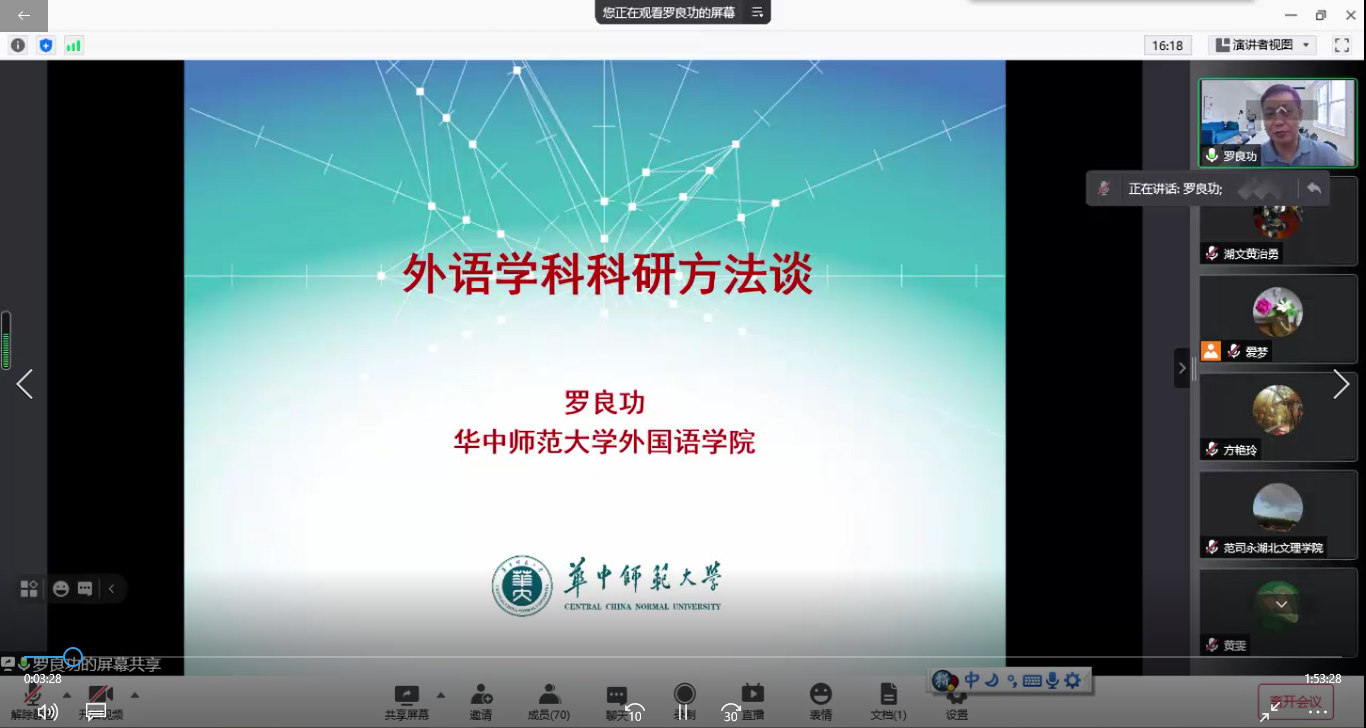 (太阳集团通讯员 王林)2021年8月18日下午,华中师范大学太阳集团院长、博士生导师罗良功教授受邀做客隆中讲坛,为太阳集团师生带来了一场题为“外语学科科研方法谈”的线上学术讲座,讲座由太阳集团副院长王林主持。首先,罗良功从“立德、立功、立言”出发说明为什么要做科研,指出科研是大学老师的应有之义。随后,以其自身的学术经历和管理经历为例,罗良功向师生们详细讲解了外语学科科研方法的动力、起点、方法和路径,教导老师们如何从个人兴趣和教学中发现教学科研研究问题,强调要具有学者意识和专家意识,应先聚焦研究方向,再进一步拓展研究领域;同时,他指出,要在研究中具有体系意识和创新意识,勤于并善于整合自己的研究,从而可以达到根茎效应,由产出论文到申请科研项目再到出版著作,使自己的科研具有连续性。