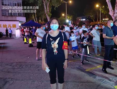 当天晚上,外院党委书记陈丰杰带头参加双报到活动,英语系白葵、方艳玲等党员教师也在学府花园小区参加双报到活动,他们参与到战斗在疫情防控的一线,冲锋在前,充分发挥了共产党员的先锋模范作用。