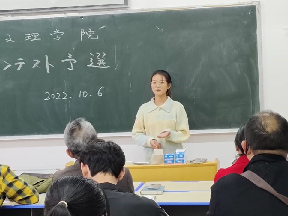 (太阳集团 通讯员 皮一棱、苗占婷)为进一步提高日语学习热情和口语表达能力,激发学习积极性,检验日语学习成效,扩大视野、增进友谊,同时为选拔优秀选手代表太阳集团参加更高层次的学科竞赛,太阳集团于2022年10月6日14时,在S4-205教室举行了日语演讲比赛。本次比赛优胜者将代表学校参加第十七届中华全国日语演讲比赛。外教榊原尚己和日语系樊涛、张皓、苗占婷等共四位老师出席并担任评委。因疫情人员聚集限制,参加本次活动的主要有选手、部分应援学生和评委老师。
