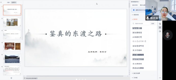 蔡欣言首先向大家介绍了鉴真在建筑、医学以及书法等领域对日本的贡献。再引用真人元开在《东征传》中的原文,向大家介绍了鉴真东渡日本的起因和契机。之后通过四组数字从鉴真东渡的次数、时间宽度、年龄跨度、随行人数变化等四个方面生动讲解了鉴真东渡的艰难以及鉴真东渡的决心。最后,蔡欣言引导师生们一起探讨了鉴真东渡的历史中所体现的思想真谛和高尚品质:坚韧不拔、不畏险阻。并讲解了鉴真东渡的故事中所体现出的“人类命运共同体”的思想理念。