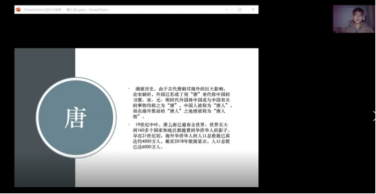 讲座从唐人街名字的由来引出,对唐人街存在的意义进行讲解。对华人来说,唐人街是连接家乡的纽带,对于外国人来说唐人街是认识了解中国的第一步。并结合自身留学体验,说明了唐人街在海外华人心目中的地位。之后从社会因素和政治因素,对唐人街的形成原因进行分析。接着分别以美国旧金山唐人街,泰国曼谷唐人街,日本横滨中华街为例,介绍其形成历史和现状。最后着眼于日本唐人街的形成历史,分别从秦汉时代,魏晋南北朝时代,隋唐时代,宋元时代,明清时代进行详细说明。通过以上事例讲解,彰显中华民族从古至今生生不息,不怕艰苦,又对生活充满热情坚忍不拔的精神。