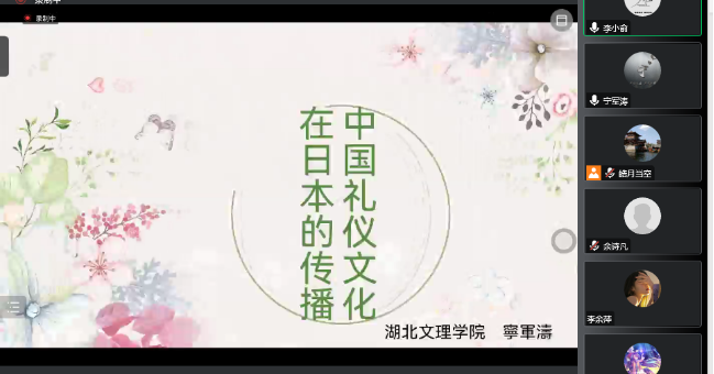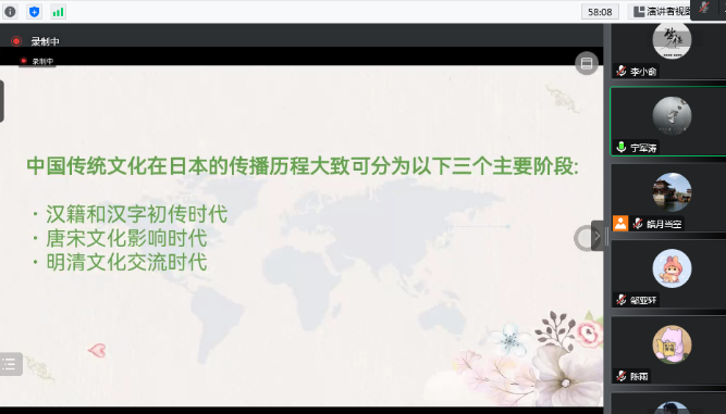 宁军涛首先带领同学们回顾了中国传统文化在日本传播的三个主要阶段:汉籍和汉字初传时代;唐宋文化影响时代;明清时代。接着简述了中国礼仪文化在日本的传播与演化。