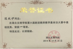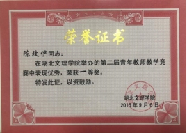 资料,认真备好每一堂课,用心讲好每一堂课。为了尽快提高教学技能和水平,陈玫伊坚持多听课,向教学经验丰富的老教师请教,多参加教研活动,在线上听视频讲座、线下听专家报告。为了向同行学习借鉴,增加实战经验,她多次参加学校组织的各类教学竞赛。一分耕耘一分收获,她先后获得学校第六届新进教师教学基本功大赛一等奖、第二届青年教师教学竞赛一等奖等多个奖项。