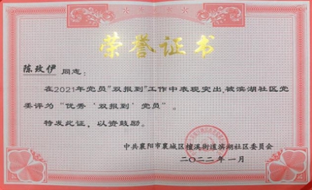 特别是在新冠肺炎疫情防控中,陈玫伊积极响应党组织号召,第一时间到社区完成了“双报到”工作,积极参与小区的疫情防控,主动服务社区居民。如此同时,她还参加了文明城市创建、防电信诈骗宣传、人口普查等志愿者服务活动。她的行动也带动和影响了一大批社区党员和居民共同参与。由于表现突出,她和志愿服务队员的事迹曾登上了《襄阳晚报》的头版头条,她也连续3年荣获“优秀党员”荣誉称号。